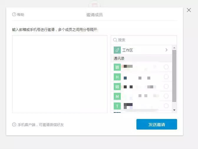 介绍到现在,工作区还是我们单独操作的,因为要协同合作,那我们就要邀请小伙伴们进入到我们的相应工作区。在各个工作区的主页面上,我们会看到邀请的方式——①链接邀请;②邮箱和手机号输入邀请