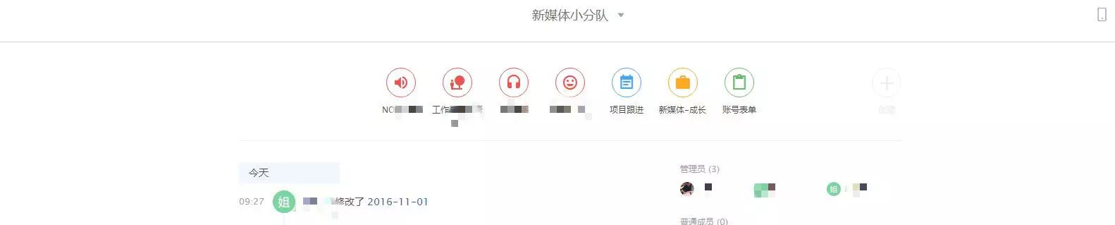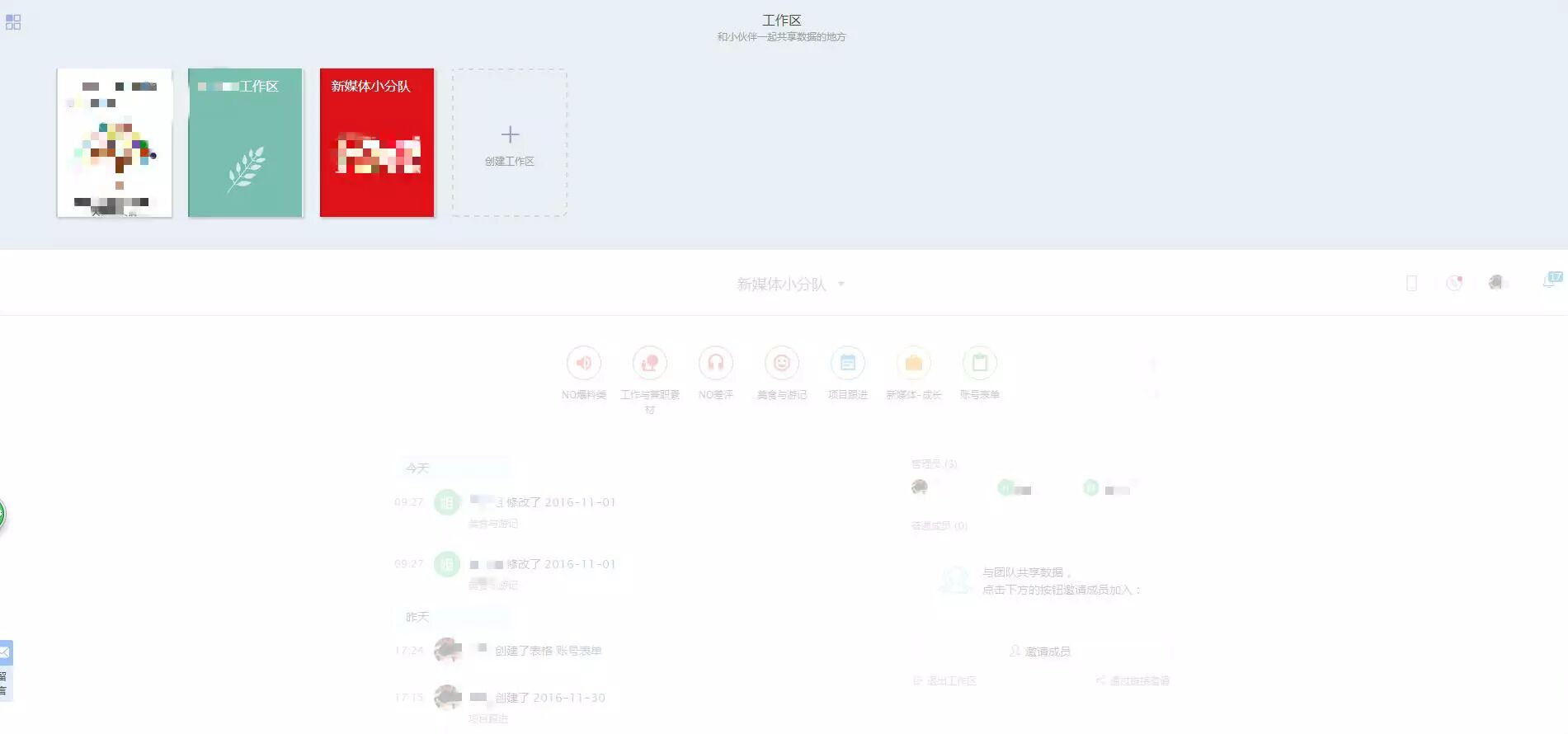 图中,是【工作区-新媒体小分队】的界面,第一行带图标的小圆圈代表你的工作表单,你可以通过戳带“+”的圆圈图标进行。
